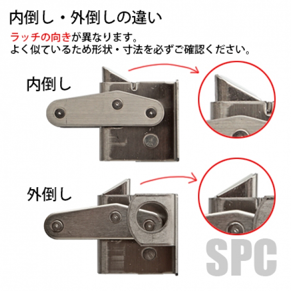 こちらの商品は内倒し窓用になります。外倒し用はラッチ向きが変わります。