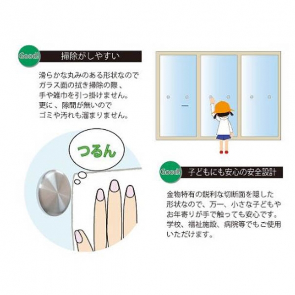 ガラスに両面から貼り付け、衝突を防止します。両面テープが見えないようにエッジを内巻きに丸みデザイン両面から貼るタイプになりますので、1箇所に2枚必要になります。